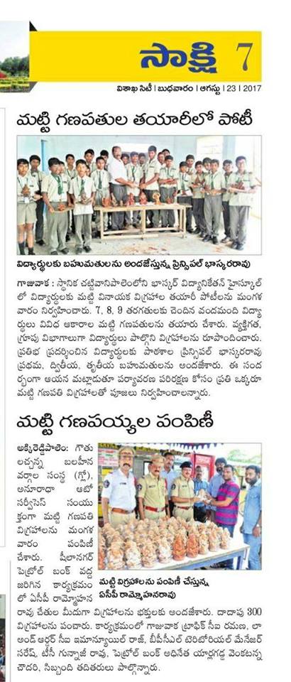 మా విశాఖపట్నం పెట్రోలు బంక్ అనురాధ ఆటో పక్క 100 అడుగులు వినాయక విగ్రహం పెడుతున్నారు.పర్యావరణ హితంగా వుండే విదంగా ఏర్పాటు చేస్తామని నిర్వాహకులు చెప్పారు