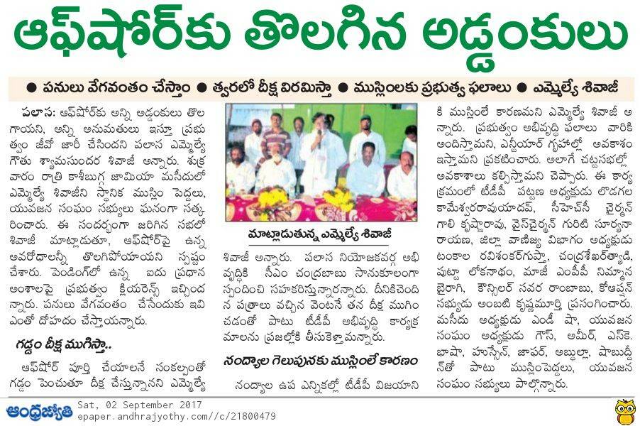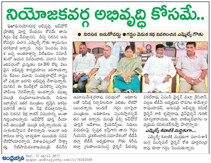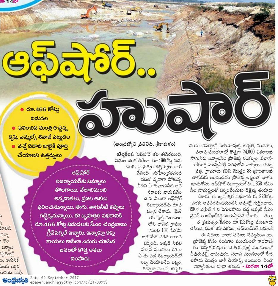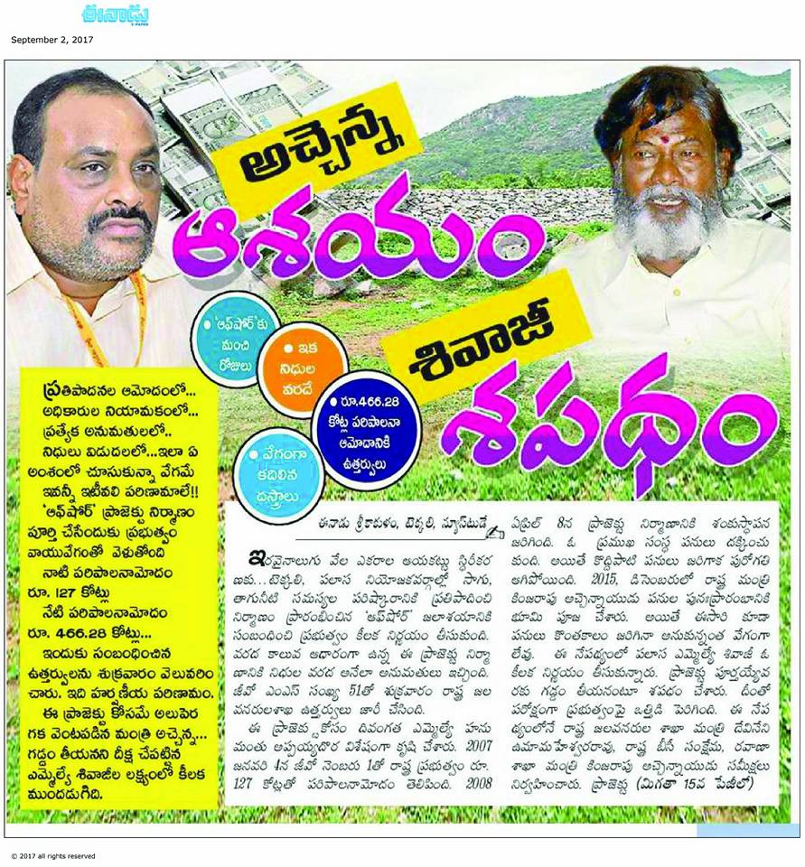 పలాస నియోజవర్గం సీనియర్ శాసనసభ్యులు మచ్చ లేని నాయకులు శ్రీ గౌతు శ్యాంసుందర్ శివాజీ గారు. ఇప్పుడు ఇతని లక్ష్యం పలాస నియోజకవర్గ ప్రజలకు సాగు నీరు పలాస మున్సిపాలిటీ ప్రజలకు శాశ్వత మంచి నీరు అందివాలని లక్ష్యం గా పెట్టుకున్నారు. అందులో భాగంగా గెడ్డం దీక్ష చేపట్టారు. ప్రభుత్వం మీద తీవ్ర వత్తిడి తీసుకొస్తున్నారు. 2006 నుండి 2014 వరకు ఈ ప్రాజెక్ట్ కోసం కేవలం 12కోట్లు ఖర్చు చేశారు గత పాలకులు. ఈ విషయాలు అన్ని దృష్టిలో పెట్టుకొని శివాజీ గారు సంబంధిత శాఖ మంత్రి వర్యులు మీద సంబంధిత శాఖ అధికారులు పైన తీవ్ర వత్తిడి తేవడం తో ఆ ప్రాజెక్ట్ లో కదలిక వచ్చింది త్వరలో సవరించిన అంచనాలు ఆమోదం పొంది జీవో జారీ కానుంది. జై శివాజీ గారు.... జై తెలుగుదేశం........