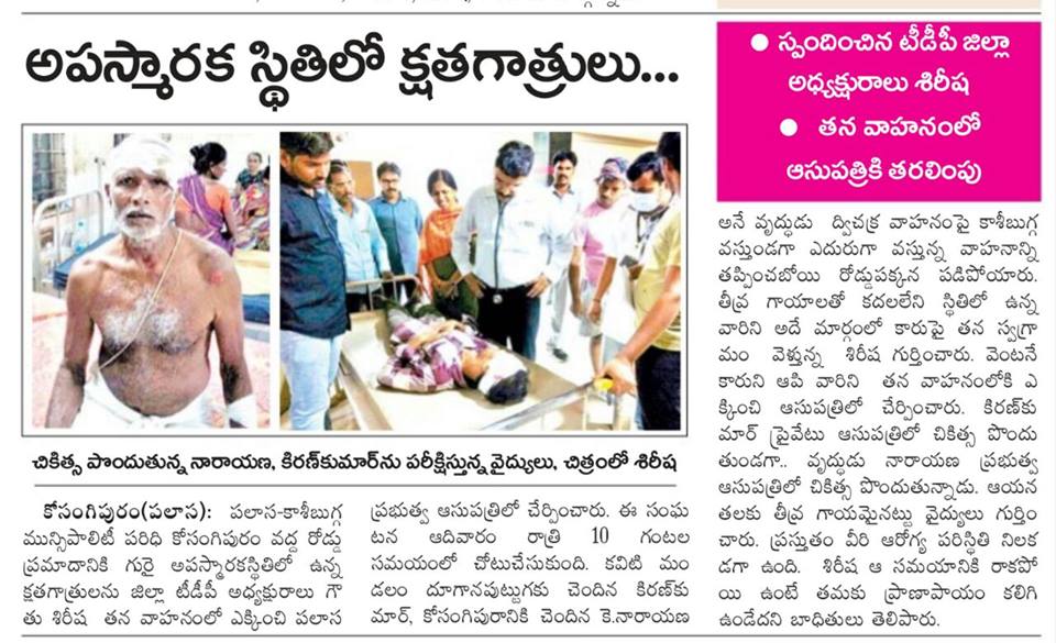 మానవత్వాన్ని చాటుకున్న టీడీపీ జిల్లా అధ్యక్షులు శ్రీమతి గౌతు శిరీష్ గారు. పక్కవాళ్ళు ఎలా పోతే మనకి ఎందుకు అన్ని ముఖం చాటేసే రోజులు ఇవి అలాంటిది ఈ రోజులో లో మానవత్వం ఇంకా మిగిలివుంది అని గౌతు శిరీష గారు నిరూపించారు. దుగానపుట్టుగా కి చెందిన కిరణ్ కుమార్, కోసంగిపురానికి చెందిన నారాయణ రావు ఆదివారం రాత్రి 9గంటల సమయంలో బైక్ పై వెళ్తుండగా ప్రమాదవశాత్తు బైక్ స్కిడై పడిపోయారు. రోడ్డుపై పడి ఉన్న వ్యక్తిలు ను చూసి శిరీష గారి మనసు చెలించి వెంటనే తన సొంత వాహనం లో తీసుకుని వెళ్లి హాస్పిటల్ లో చేర్పించారు. ఆ సమయానికి రాకపోయి ఉంటే తమకు ప్రాణాపాయం కలిగి ఉండేదని బాధితులు తెలిపారు. ఇలాంటి పరిస్థితుల్లో పోలీసులు కు సమాచారం ఇచ్చి చేతులు దులుపుకునే రోజులో ఇలా చేయడం ఆమె కార్యదీక్షకు నిదర్శనం.