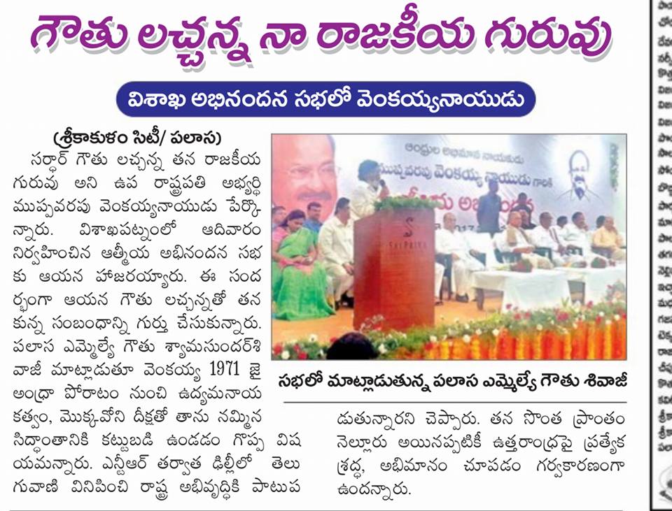 నిన్న గాజువాక లో జరిగిన ఉత్తరాంధ్ర పట్టభద్రుల MLC మాధవ్ విజయోత్సవ ర్యాలీ మధ్యలో కేంద్ర మంత్రివర్యులు వెంకయ్య నాయుడు గారు షీలా నగర్ గాజువాక మా పెట్రోల్ బంక్ అనురాధ ఆటో లో ఉన్న తన గురువు డా.సర్దార్ గౌతు లచ్చన్న గారి విగ్రహానికి దండ వేసి కార్యక్రమం కొనసాగించారు.ఆ తరువాత STBC లో జరిగిన సభ లో శివాజీ గారు మరియు శిరీష ప్రసంగించారు.కొత్త ఆశలు, మరిన్ని సమస్యలు వీటన్నిటికీ పరిష్కారం కోసం అందరూ పనిచేయాలి.వెంకయ్య నాయుడు గారు ఆద్యంతం స్ఫూర్తి దాయకమైన ప్రసంగం చేశారు