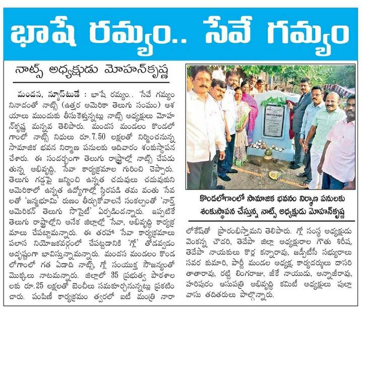 నార్త్ అమెరికా తెలుగు సంఘం (నాట్స్) NATS మరియు గౌతు లచ్చన్న బలహీన వర్గాల సంస్థ (గ్లో) సంయుక్తంగా ఉత్తరాంధ్ర జిల్లాలో పలు కార్యక్రమాలు చేపడుతున్న విషయం విదితమే.అందులో భాగంగా శ్రీకాకుళం జిల్లా మందస మండలం గిరిజన గ్రామమైన కొండలోగం లో సామాజిక భవనం నకు శంకుస్థాపన జరిగింది.ఈ కార్యక్రమానికి ప్రత్యేకంగా నాట్స్ అధ్యక్షులు మోహాన్ కృష్ణ మన్నవ రావడం జరిగింది.