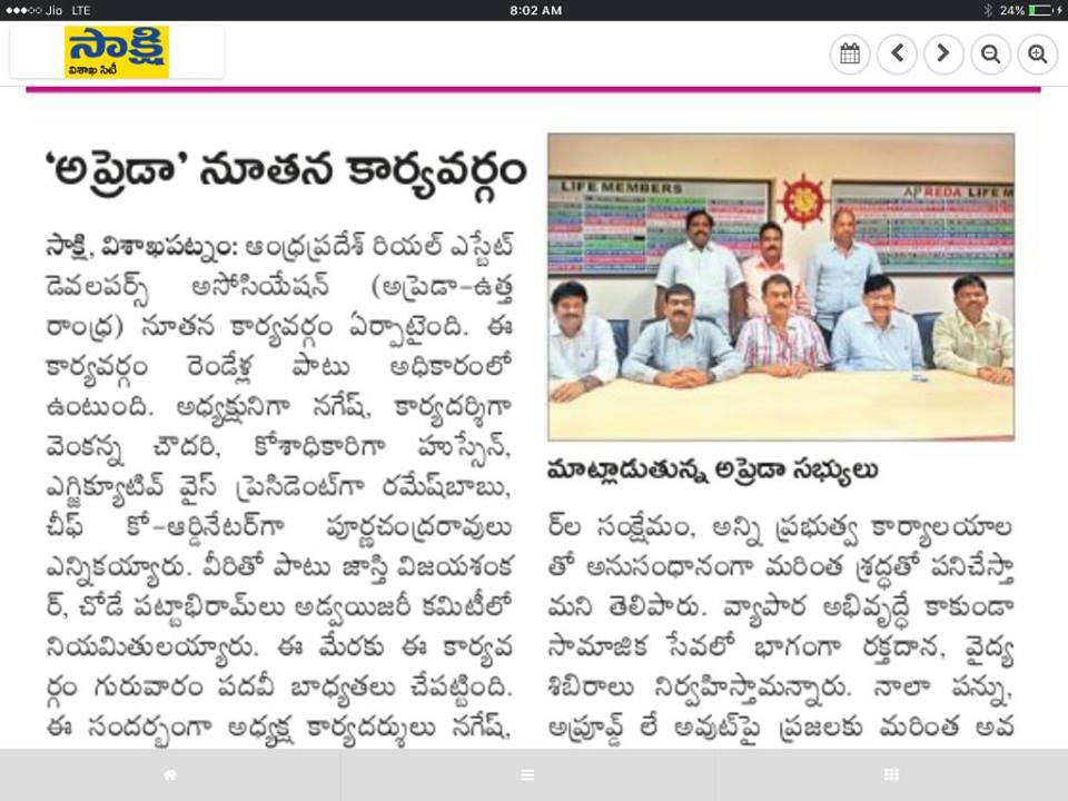 APREDA (ఆంధ్రప్రదేశ్ రియల్ ఎస్టేట్ దేవేలోపర్స్ అసోసియేషన్) ఉత్తరాంధ్ర కు వచ్చే రెండు సంవత్సరాలకు కార్యదర్శిగా ఎన్నిక కాబడ్డాను.మిత్రులందరి సహకారం తో ఈ భాధ్యతను సక్రమంగా నిర్వహించాలి.నా మీద నమ్మకం తో నన్ను ప్రతిపాదించిన అందరకీ ధన్యవాదములు.
