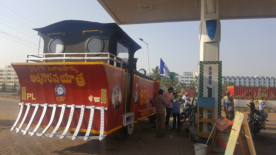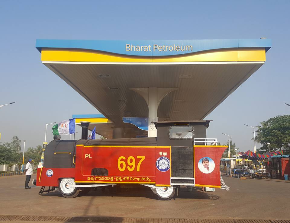 ఛుక్ ఛుక్ రైలు బండి మా గాజువాక పెట్రోల్ బంక్ అనురాధ ఆటో కి వచ్చింది....అసలు రైలు ఇంజిన్ లాగ వుంది. వివరం లోకి వెళితే....విశాఖ రైల్ జోన్ సాధన కొరకు మిత్రుడు గుడివాడ అమర్నాధ్ ప్రత్యేక ప్రచార రధం తయారు చేయించుకున్నారు.ఆ రధం డీజిల్ కొరకు మా పెట్రోల్ బంక్ కి వచ్చింది.. రైల్వే జోన్ వస్తే మంచిది కాబట్టి , రావాలని కోరుకుంటున్నాను