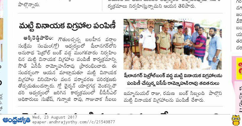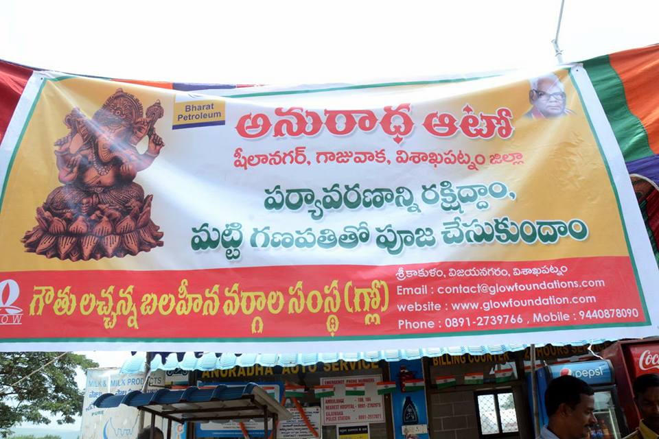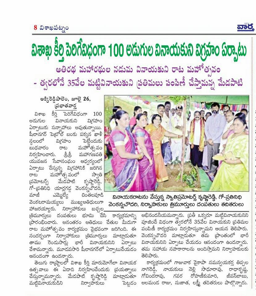 మా విశాఖపట్నం పెట్రోలు బంక్ అనురాధ ఆటో పక్క 100 అడుగులు వినాయక విగ్రహం పెడుతున్నారు.పర్యావరణ హితంగా వుండే విదంగా ఏర్పాటు చేస్తామని నిర్వాహకులు చెప్పారు
