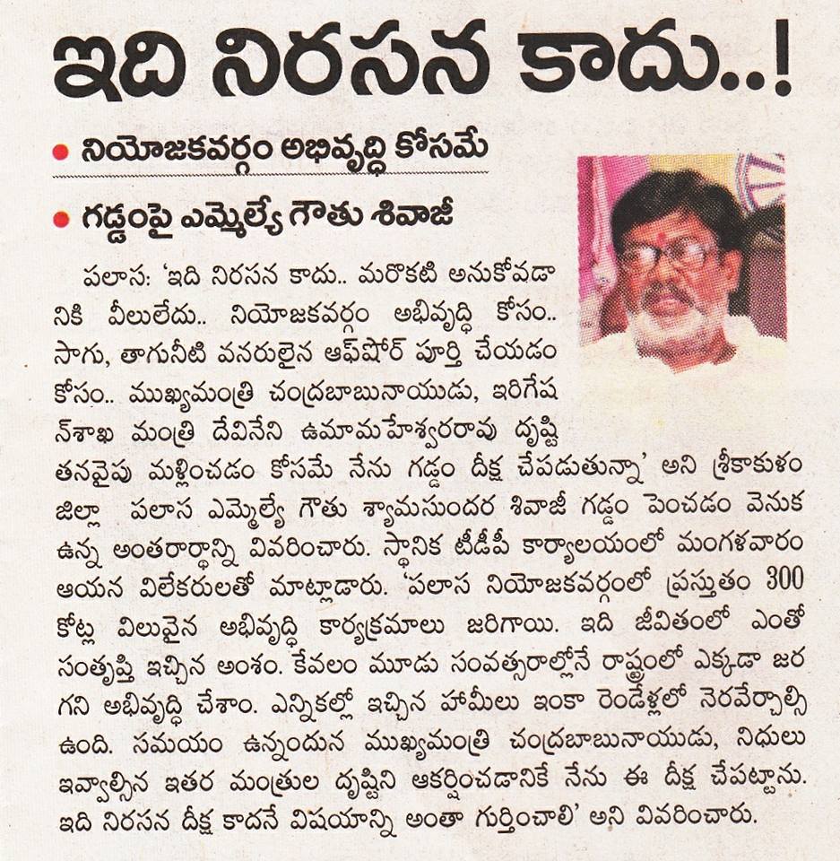 పలాస నియోజవర్గం సీనియర్ శాసనసభ్యులు మచ్చ లేని నాయకులు శ్రీ గౌతు శ్యాంసుందర్ శివాజీ గారు. ఇప్పుడు ఇతని లక్ష్యం పలాస నియోజకవర్గ ప్రజలకు సాగు నీరు పలాస మున్సిపాలిటీ ప్రజలకు శాశ్వత మంచి నీరు అందివాలని లక్ష్యం గా పెట్టుకున్నారు. అందులో భాగంగా గెడ్డం దీక్ష చేపట్టారు. ప్రభుత్వం మీద తీవ్ర వత్తిడి తీసుకొస్తున్నారు. 2006 నుండి 2014 వరకు ఈ ప్రాజెక్ట్ కోసం కేవలం 12కోట్లు ఖర్చు చేశారు గత పాలకులు. ఈ విషయాలు అన్ని దృష్టిలో పెట్టుకొని శివాజీ గారు సంబంధిత శాఖ మంత్రి వర్యులు మీద సంబంధిత శాఖ అధికారులు పైన తీవ్ర వత్తిడి తేవడం తో ఆ ప్రాజెక్ట్ లో కదలిక వచ్చింది త్వరలో సవరించిన అంచనాలు ఆమోదం పొంది జీవో జారీ కానుంది. జై శివాజీ గారు.... జై తెలుగుదేశం........