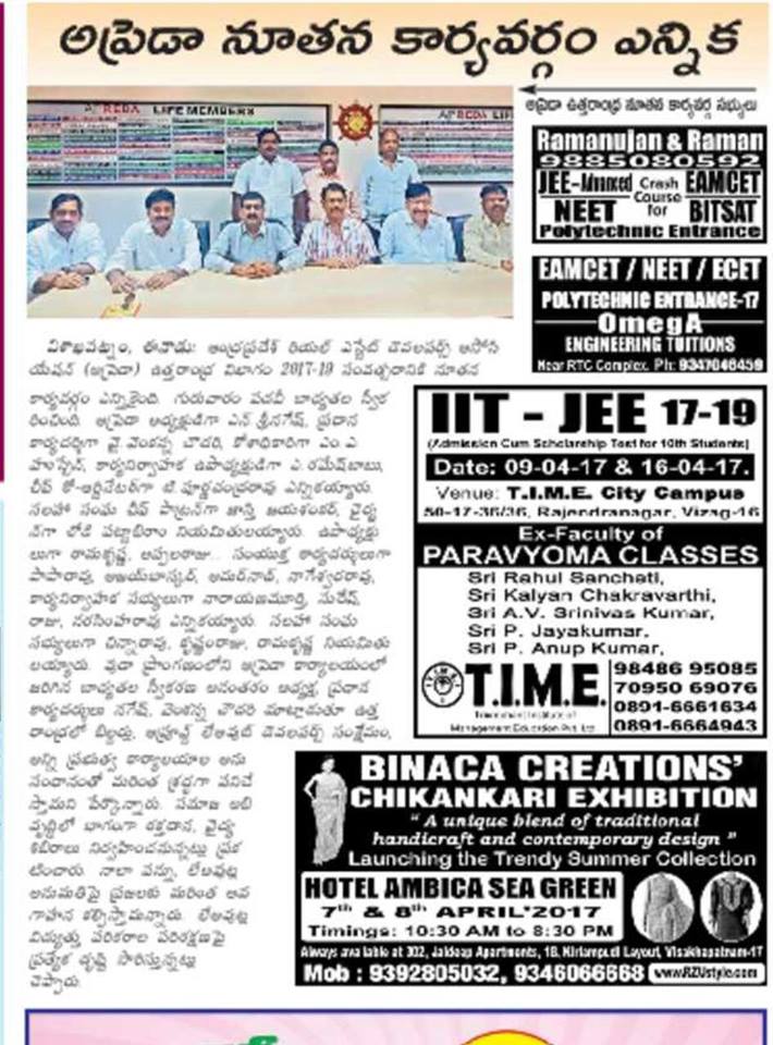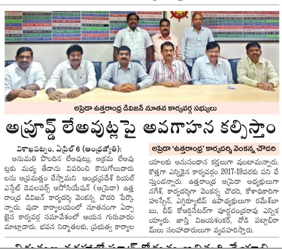 APREDA (ఆంధ్రప్రదేశ్ రియల్ ఎస్టేట్ దేవేలోపర్స్ అసోసియేషన్) ఉత్తరాంధ్ర కు వచ్చే రెండు సంవత్సరాలకు కార్యదర్శిగా ఎన్నిక కాబడ్డాను.మిత్రులందరి సహకారం తో ఈ భాధ్యతను సక్రమంగా నిర్వహించాలి.నా మీద నమ్మకం తో నన్ను ప్రతిపాదించిన అందరకీ ధన్యవాదములు.