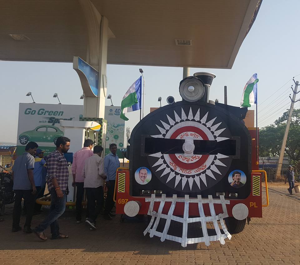 ఛుక్ ఛుక్ రైలు బండి మా గాజువాక పెట్రోల్ బంక్ అనురాధ ఆటో కి వచ్చింది....అసలు రైలు ఇంజిన్ లాగ వుంది. వివరం లోకి వెళితే....విశాఖ రైల్ జోన్ సాధన కొరకు మిత్రుడు గుడివాడ అమర్నాధ్ ప్రత్యేక ప్రచార రధం తయారు చేయించుకున్నారు.ఆ రధం డీజిల్ కొరకు మా పెట్రోల్ బంక్ కి వచ్చింది.. రైల్వే జోన్ వస్తే మంచిది కాబట్టి , రావాలని కోరుకుంటున్నాను